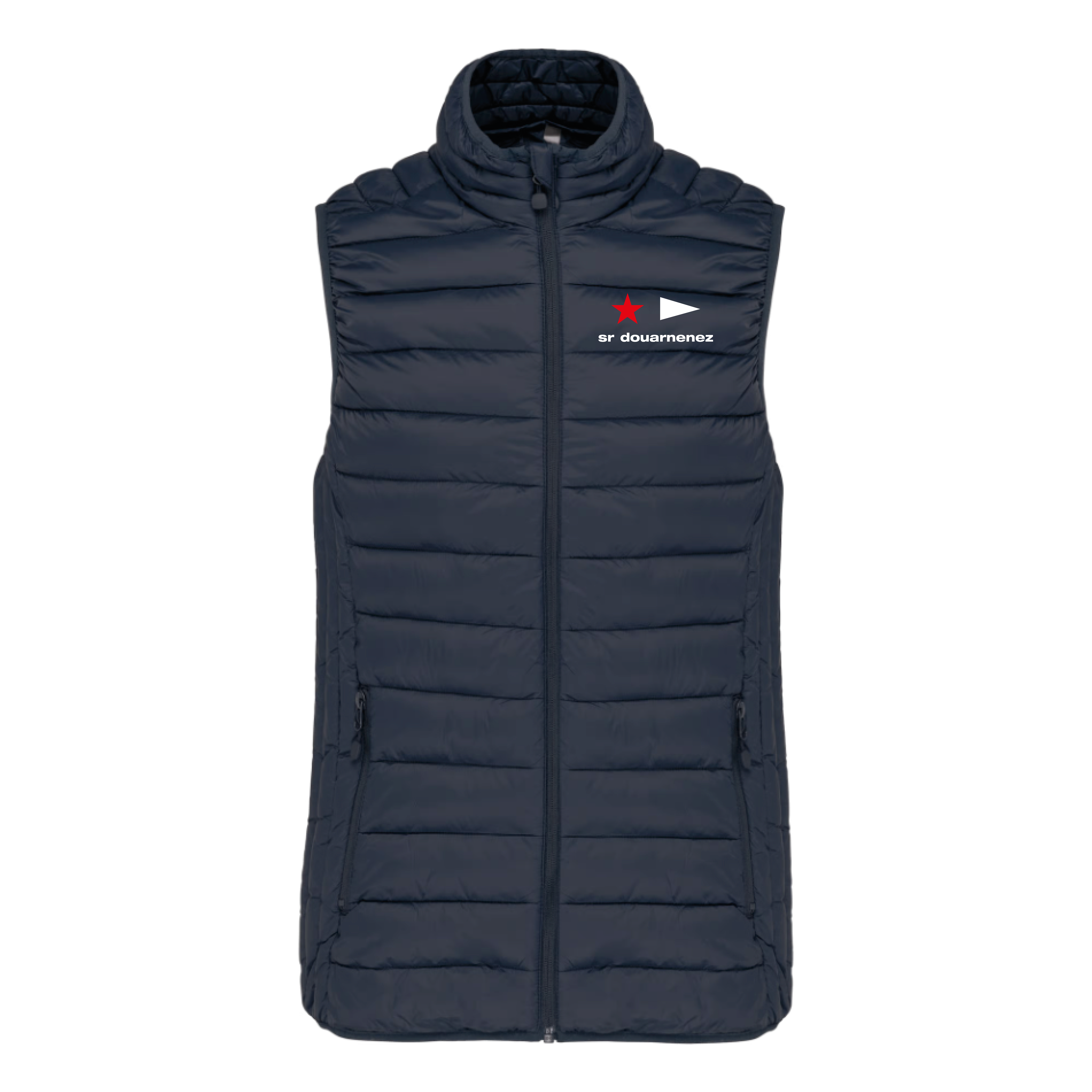 Emmanchures élastiquées. 2 poches latérales. Coupe droite. Col montant.