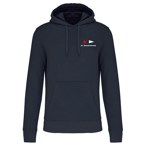 Sweat à capuche. Bord inférieur et poignets en côte élasthanne 1x1. Double surpiqûre au niveau des emmanchures. Poche kangourou. Capuche ton sur ton. Manches montées. Coutures latérales.